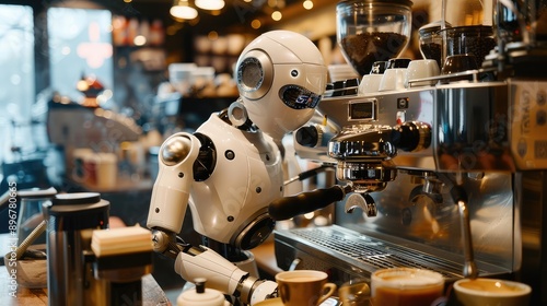 A futuristic robot barista carefully prepares a cup of coffee using a professional espresso machine