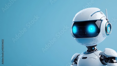 A futuristic robot featuring large expressive blue eyes and high-tech headgear emanates a welcoming presence against a clean, vibrant blue background.
