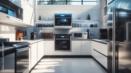 A futuristic smart kitchen with touchless appliances, featuring a voice-controlled oven, smart refrigerator, and automated coffee dispenser, with sunlight reflecting off sleek surfaces.