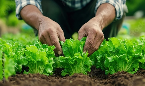A gardener carefully tends to vibrant green lettuce growing in neat rows in his garden.