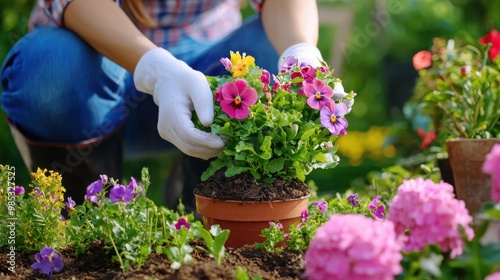 A gardener planting colorful flowers in a pot, showcasing the beauty of nature and the joy of gardening.