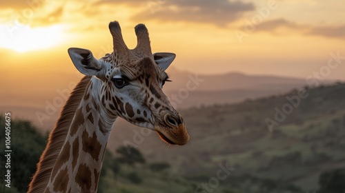 giraffe, sunset, animal, wildlife, nature, africa, savanna, safari, mammal, long, neck, pattern, coat, gold, light, mountain, hill, landscape, horizon, sky, cloud, tree, green, brown, wild, majestic, graceful, beautiful, exotic, endangered, conservation, photo, photo, image, picture, stock, digital, download, high-quality, royalty free, licence, vector, graphic, illustration, design, artwork, print, poster, banner