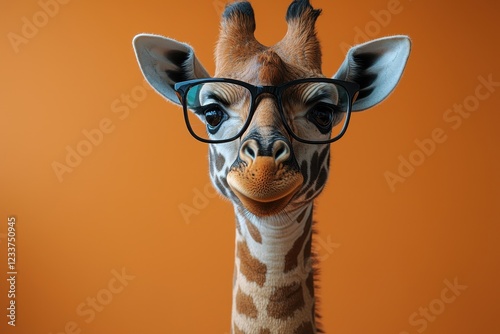A giraffe wearing glasses against an orange background, exuding a playful vibe.