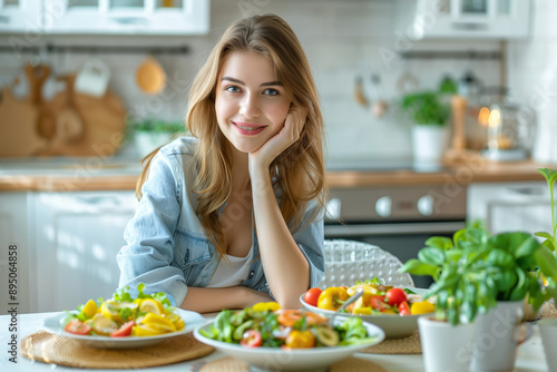 a girl is smiling as she eats a healthy dinner, beautiful women, colorist, lunch in the kitchen, vegan food, vegetarian, fruits, female nutritionist analyzing the nutritional components of the dish