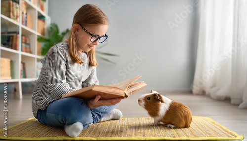 pet, animal, vibrant, photo, guinea pig, reading, cosy, afternoon, sunny, home, indoor, exploration, friendship, confidence, joy, curiosity, leisure, education, bond, childhood, happiness, contentment, carpet, sharpened, companionship, fun, warmth, soft light, concentrated, entertainment, playtime, relaxation, youth, wonder, life events, affection, storytelling, nature, calmness, family, pet, moment