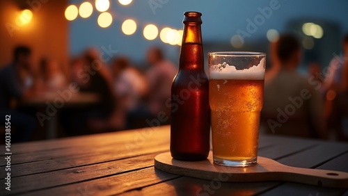 A glass of beer next to a bottle of beer on a wooden table.
