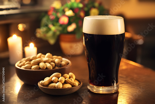 A glass of beer sits on a table next to a bowl of peanuts