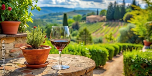 A glass of Chianti wine, sitting on a stone table surrounded by lush greenery and terracotta pots, olive grove, italian cuisine, cypress trees, wine and food