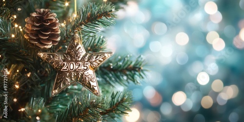 A glittering star ornament with 2025 hanging on a Christmas tree surrounded by warm lights and pinecones in a festive setting