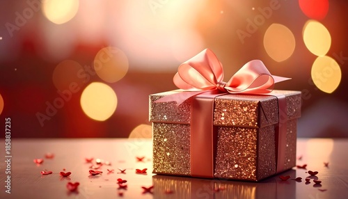 A glittery gift box with a pink ribbon sits on a table. Tiny heart confetti and bokeh lights enhance the romantic scene