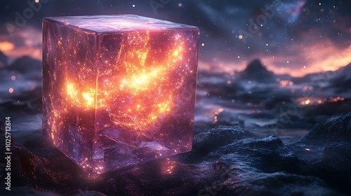 A glowing cube with an orange and purple nebula inside sits on a rocky surface in front of a dark, mysterious sky.