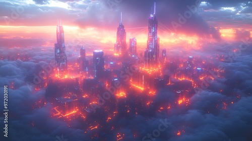A glowing digital metropolis floating above a sea of clouds, with illuminated threads connecting every building. The city shines with neon colors, reflecting in the misty cloudscape below,