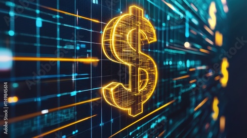 A glowing dollar sign amidst a digital backdrop, symbolizing finance, technology, and the future of money.