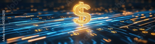 A glowing dollar symbol represents financial growth and technology in a digital landscape, symbolizing money and innovation.