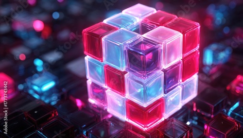 cube, glowing, abstract, geometric, neon, light, colours, glasses, shiny, bright, technology, futuristic, three-dimensional, rendering, design, shape, pattern, structure, digital, modern, vibrant, pink, blue, purple, illuminated, transparent, cube, matrix, array, tech, illumination, energy, virtual, system, complex, intricate, innovation, composition, arrangement, geometry, graphic