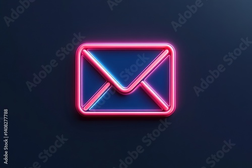A glowing neon mail icon with pink and blue lights on a dark background in a studio shot style
