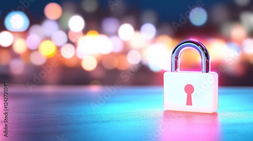 A glowing padlock stands on a surface, illuminated by colorful bokeh lights, symbolizing security and protection in a vibrant urban setting.