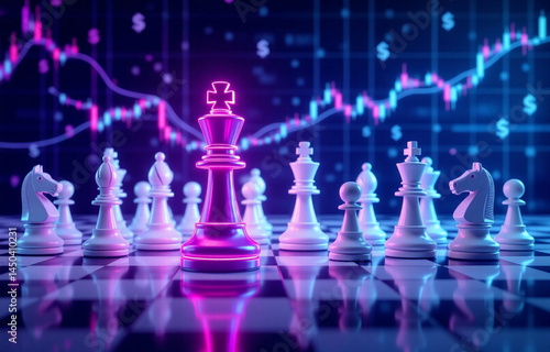 A glowing purple king chess piece stands tall amidst white pieces, set against a vibrant backdrop of financial market charts. It symbolizes strategic market leadership and calculated risk.
