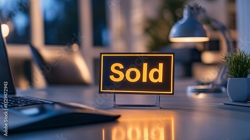 A glowing real estate "Sold" sign styled on a clean desktop with subtle accents. background