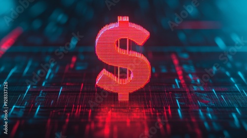 A glowing red dollar symbol on a digital grid backdrop, symbolizing finance and technology in a modern economy.