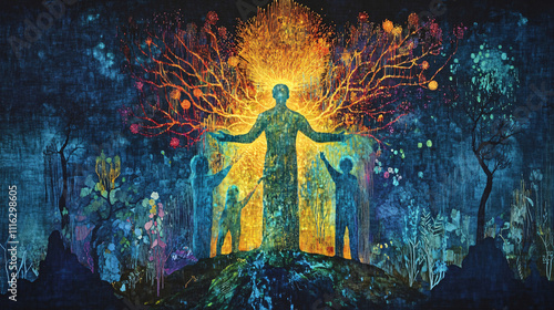 A glowing tapestry woven from threads of light, each thread representing a family member, with a central figure repairing torn sections.