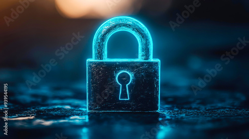 A glowing turquoise padlock on a dark surface, symbolizing data security and cyber protection ideal for use in cybersecurity themes and online privacy,