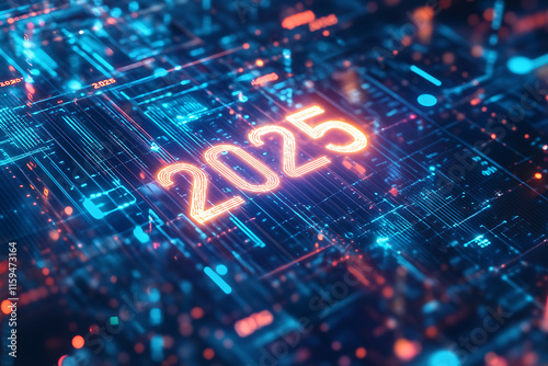 A glowing wireframe illustration of the text "2025" in the center of a transparent background, highlighted by intricate blue and black data points, symbolizing futuristic innovation and progress.