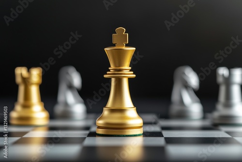 A golden chess king stands prominently among silver knight pieces on a chessboard