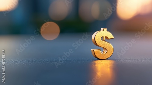 A golden dollar sign stands prominently on a surface, illuminated by soft, warm bokeh lights in the background, symbolizing wealth and finance.