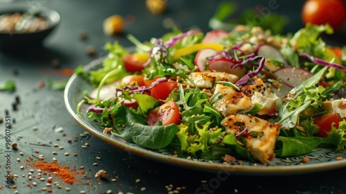 A gourmet salad with various toppings, served on a white plate.