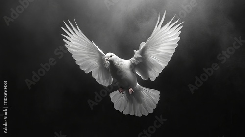 A graceful white dove captured mid-flight with its wings fully spread, symbolizing peace, freedom, and purity against a contrasting dark background.