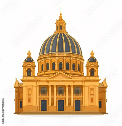 A grand Baroque-style cathedral with a domed roof, flanked by two bell towers. Its intricate architecture includes arched windows and detailed pillars, symbolizing classical grandeur.
