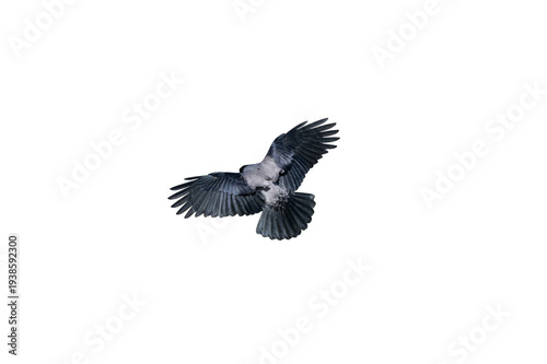 A gray and black-feathered carrion crow, isolated on a transparent surface, displaying its rear view with its wings spread during flight.