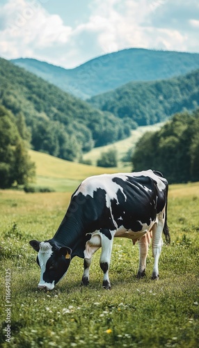 A grazing cow in a lush green landscape with rolling hills in the background.