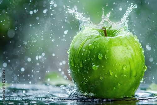 A green apple is sitting in a puddle of water. The water is splashing around the apple, creating a sense of movement and energy. The image conveys a feeling of freshness and vitality
