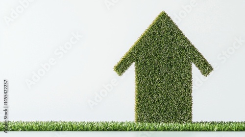 A green arrow made of grass pointing upward stands on a grassy surface against a plain background, symbolizing growth and sustainability.