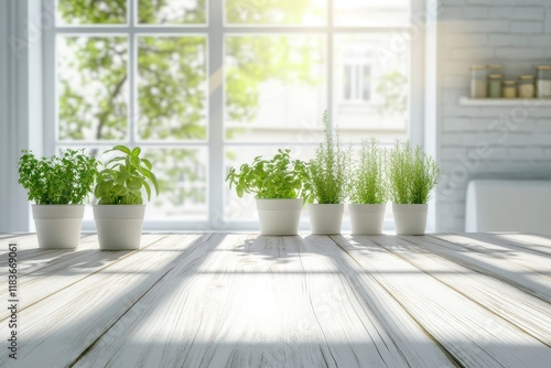 A green wooden table in front of a bright white kitchen blurred by golden bokeh sunshine