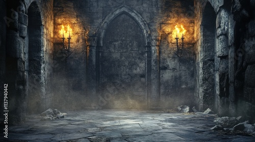 A grim medieval dungeon with flickering torches and ancient stone walls, ideal for a game or fantasy backdrop