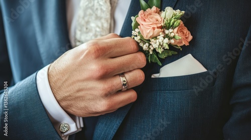 A groom's hand adjusting his cufflinks, with a beautifully arranged boutonniere on his lapel.