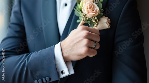 A groom's hand adjusting his cufflinks, with a beautifully arranged boutonniere on his lapel.