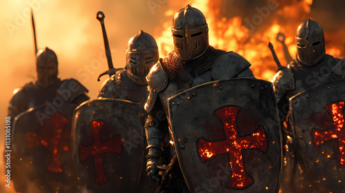 A group of armored knights stands defiantly against a fiery backdrop, showcasing their distinctive shields emblazoned with a red cross. Emblazoned. Illustration