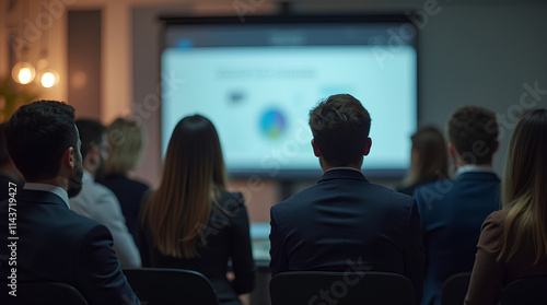 A group of business professionals gathered in a seminar, attentively watching a digital presentation. The scene captures the atmosphere of a formal corporate environment