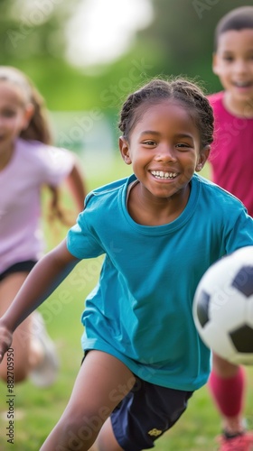 children, soccer, playing, field, grass, park, smiling, running, exercise, youth, fun, sport, activity, team, childhood, happiness, green, sunny, friends, teamwork, athletic, recreation, joyful, game, summer, football, action, group, health, playground, leisure, energetic, competitive, lively, nature, fitness, movement, dynamic