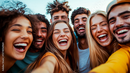 A group of diverse young friends joyfully pose for a selfie, capturing a moment of shared laughter and happiness together.