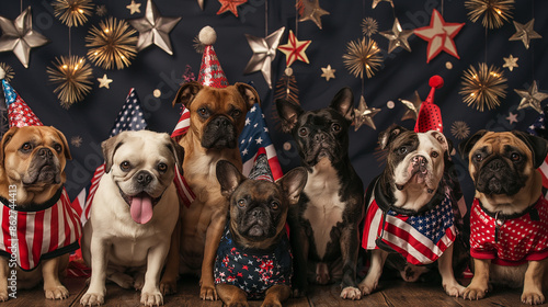 A group of dogs in various American flag outfits, posing together for a festive 4th of July photo, with a backdrop of fireworks and patriotic decorations. Pet fashion and national