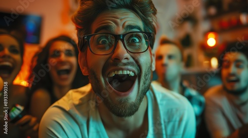 A group of friends laughing and watching something exciting together. A man in the foreground wears glasses and has a surprised expression.