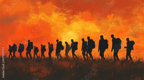 sunset, silhouette, group, people, walking, sky, cloud, horizon, field, grass, journey, travel, adventure, hope, freedom, together, future, direction, movement, faith, strong, determination, courage, optimism, destination, path, life, dream, challenge, success, human, silhouette