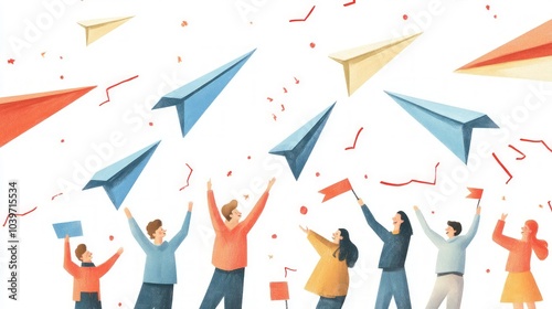celebration, party, people, group, happy, joy, success, achievement, confetti, paper, aeroplane, flying, teamwork, friendship, oneness, diversity, fun, excitement, positive, optimistic, hope, dream, aspiration, future, progress, growth, ambition, vision, goal, motivation, inspiration, togetherness, collaboration, community