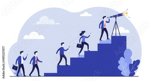 A group of professionals ascending steps, with one using a telescope to look ahead.