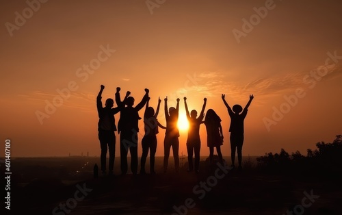 silhouette, happy, group, people, woman, man, team, successful, together, hand, raise, young, concept, rejoice, success, achievement, person, motivation, sunset, victory, teamwork, business, goal, lifestyle, challenge, nature, society, future, happiness, freedom, company, competition, cooperation, global, winner, black, support, tomorrow, energetic, management, corporate, businessman, positive, colleague, generative, ai